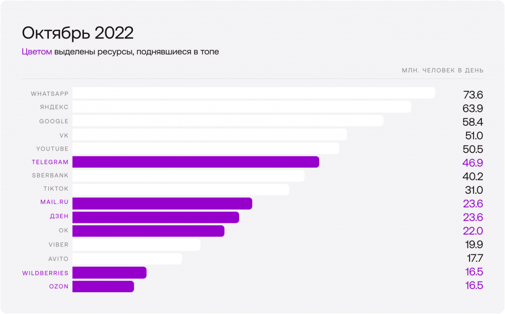 VK пользуется 73,4 млн российских пользователей в месяц, по статистике самой соцсети. Общая аудитория в мире составляет 101,7 млн человек. График Statista  доказывает, что большой процент российских пользователей зарегистрирован в этой соцсети. Охват, который даёт ВК и его функции (вложения, сообщества, видео и звонки), позволяет проводить маркетинговые кампании, рассылки разного типа и общаться с клиентами, не выходя из одного приложения.